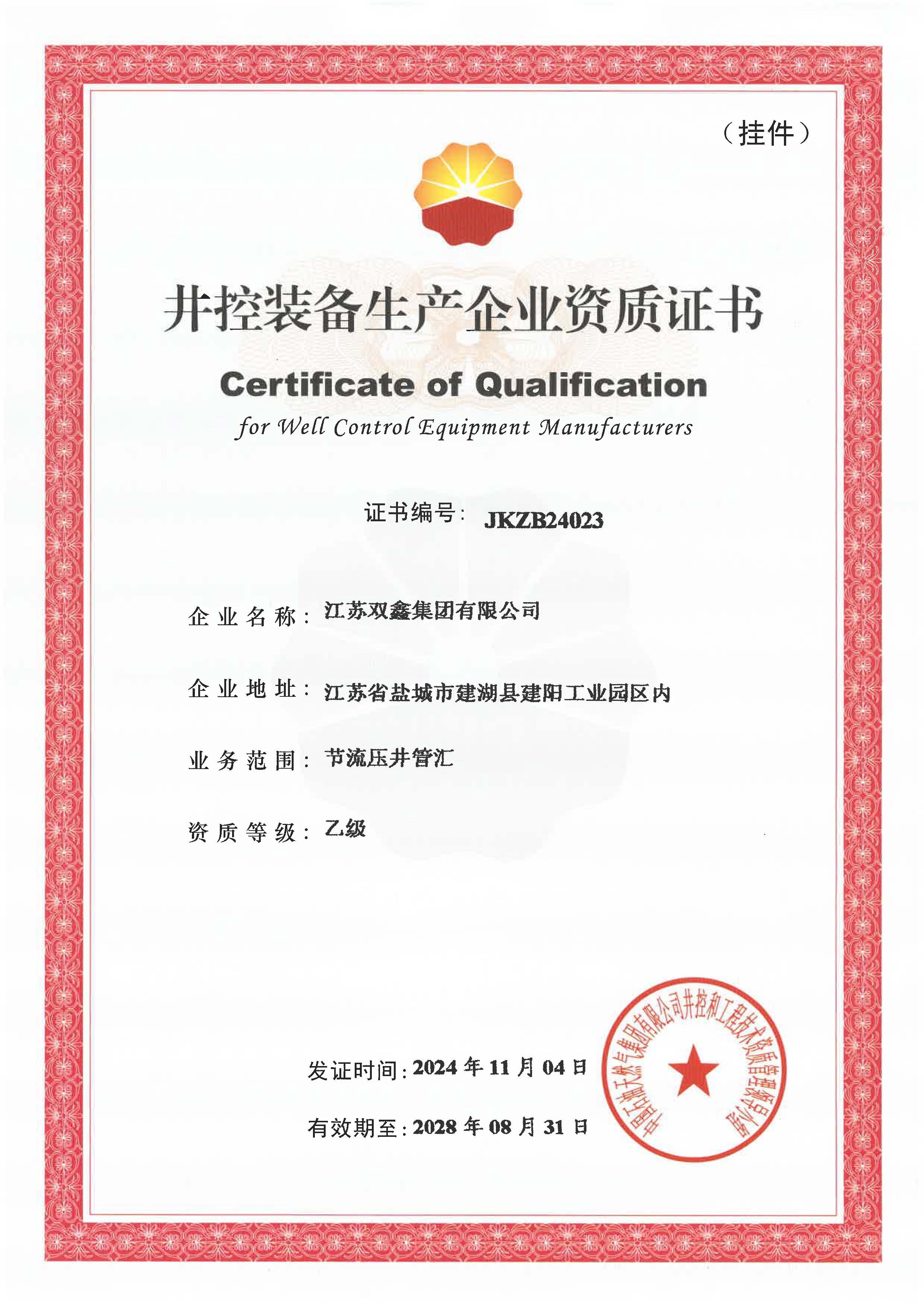 Well control equipment manufacturing enterprise certificate